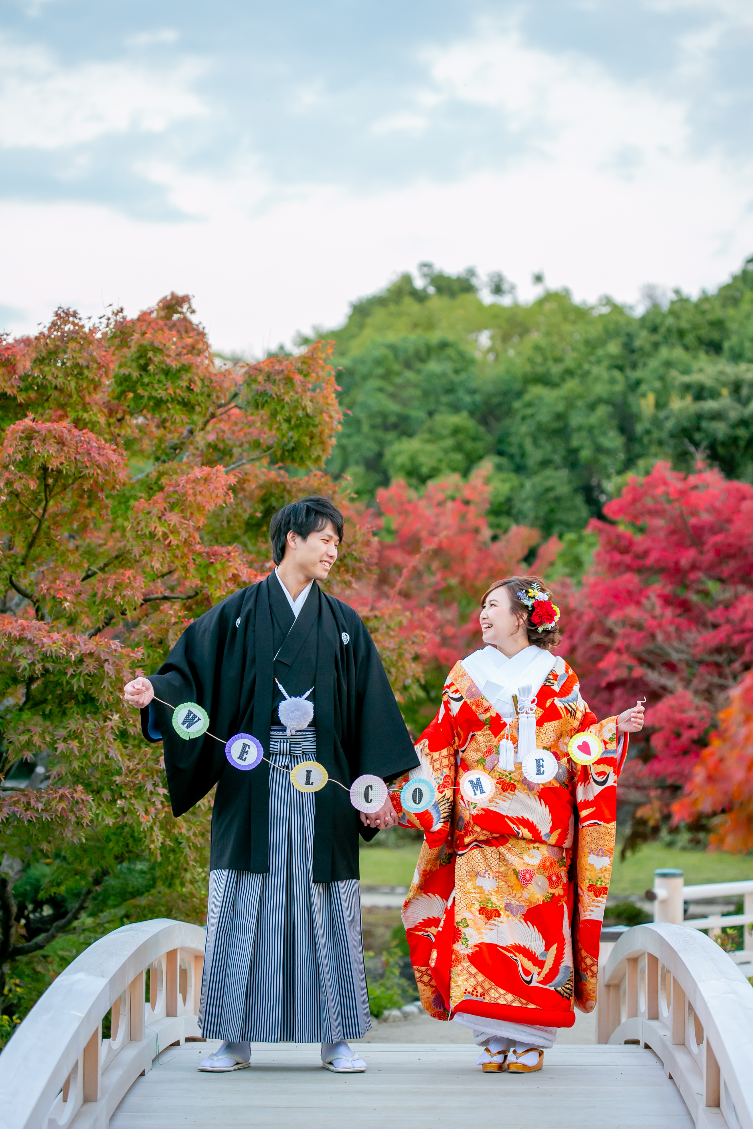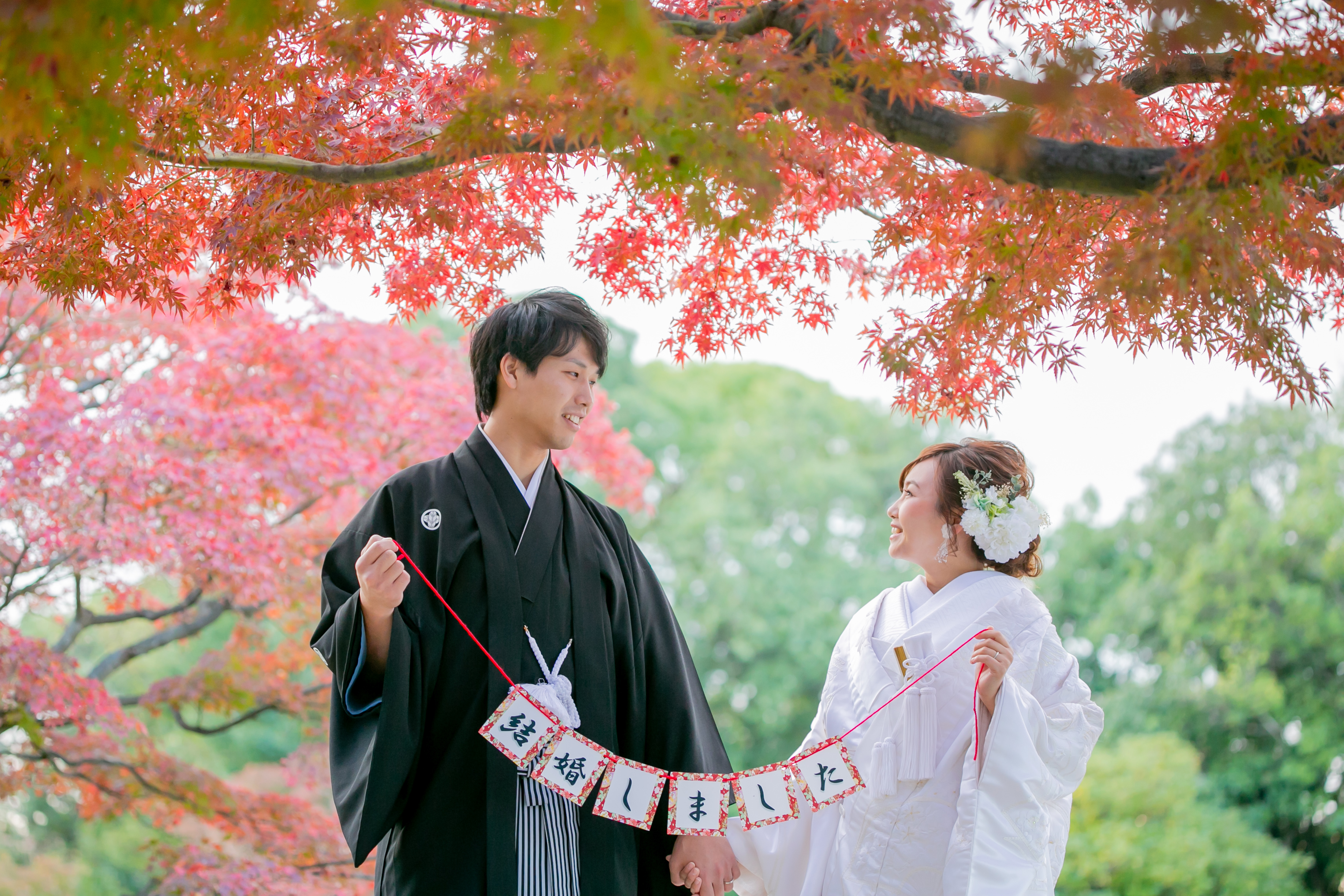 ご覧のお二人も、秋の紅葉前撮りを 楽しんでみませんか♪
