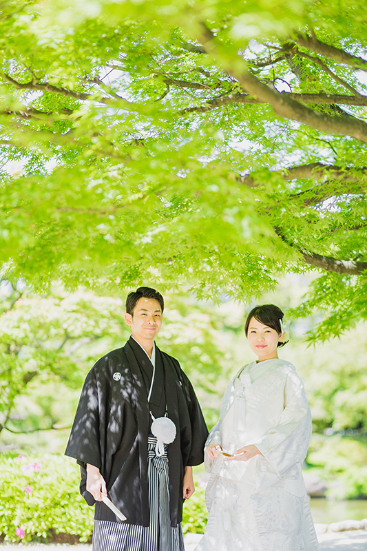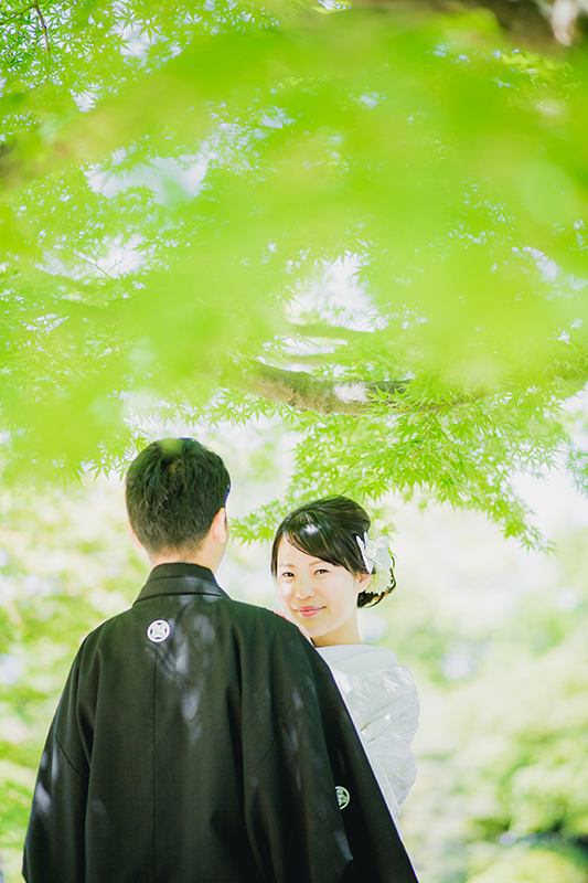 真っ白な白無垢と 緑のコントラストが