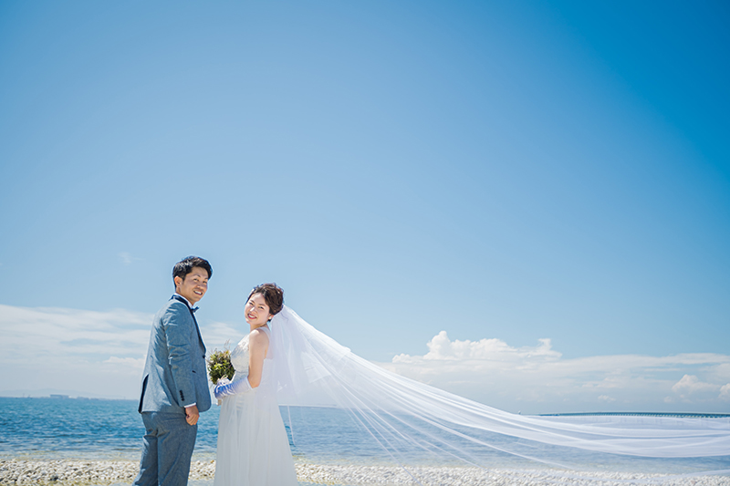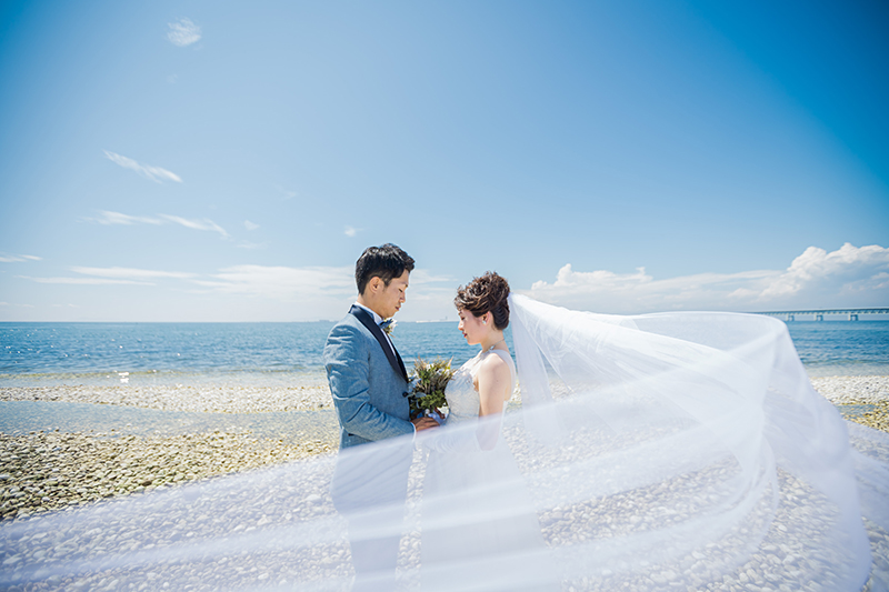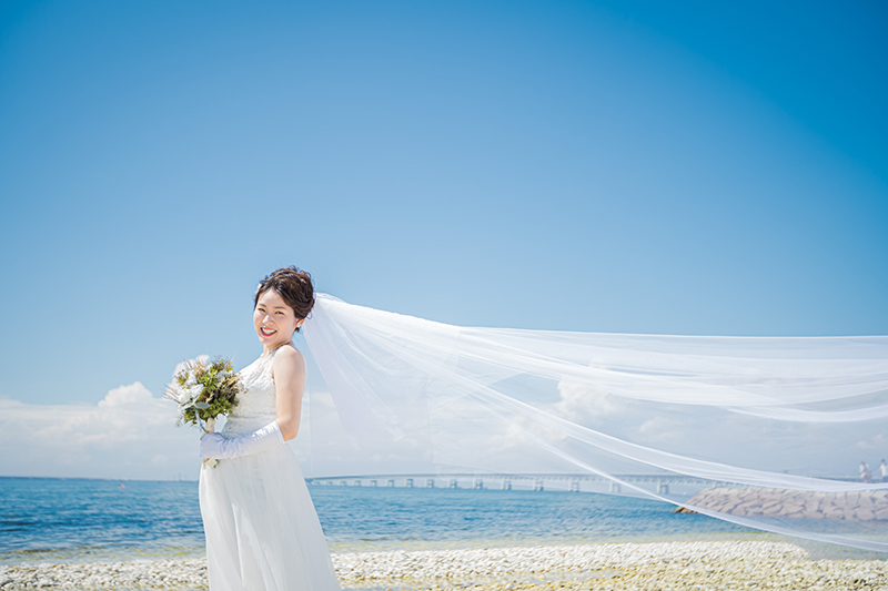 青い空と海に、ヴェールが美しく舞わせた
