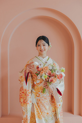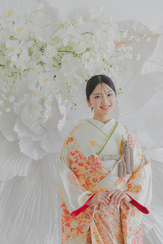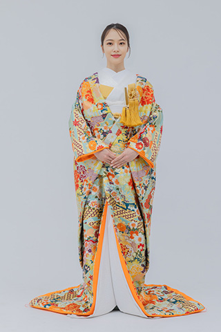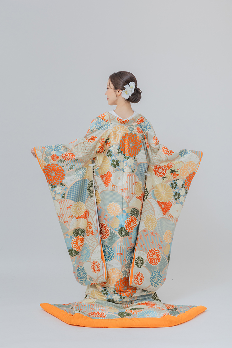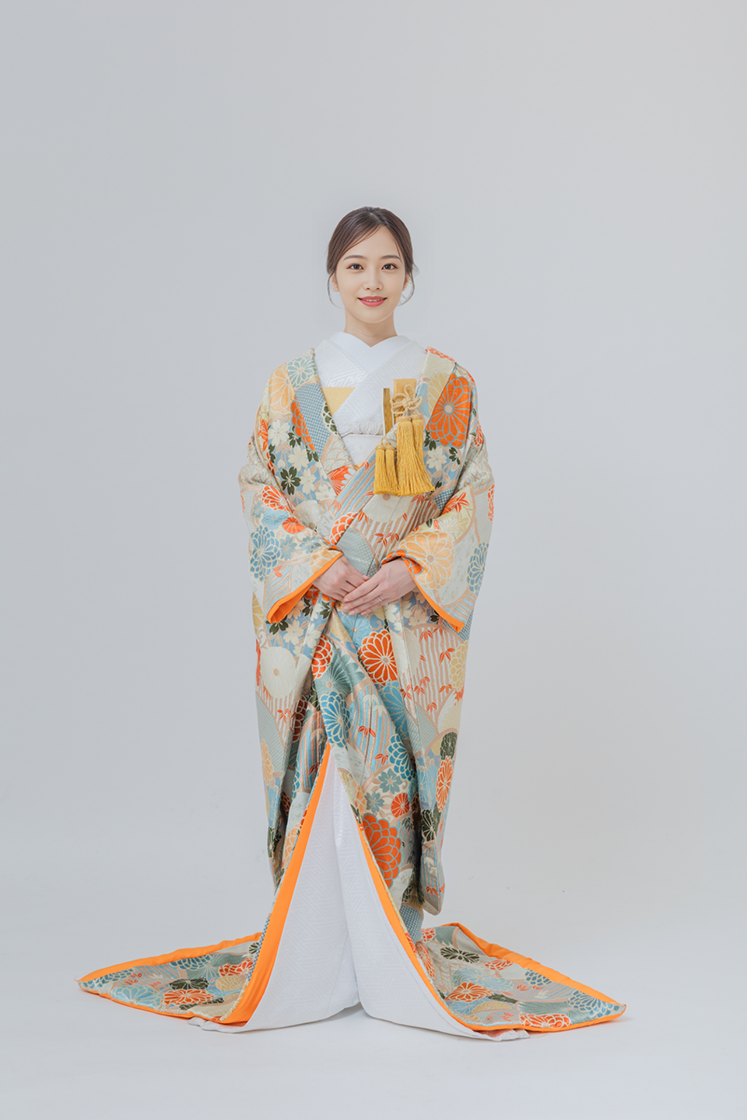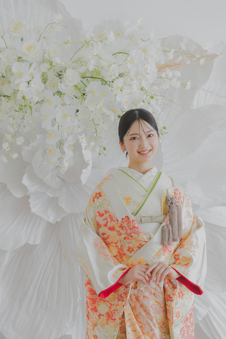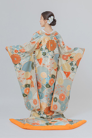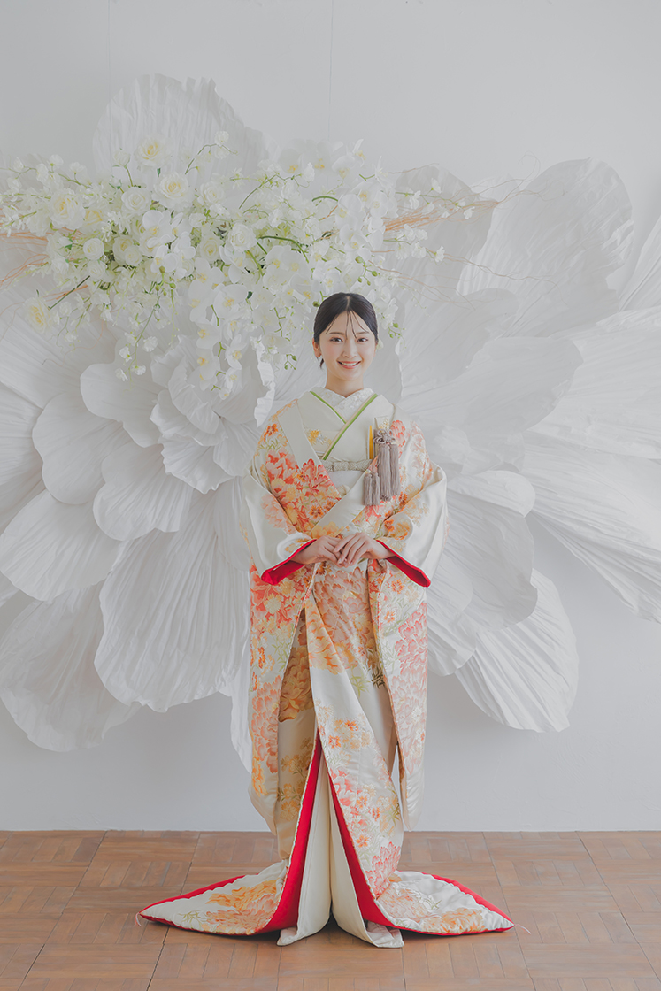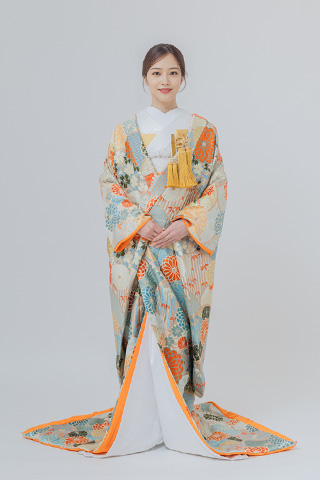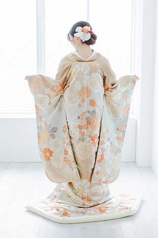 白地にオレンジの花が舞う、爽やかな色打掛。