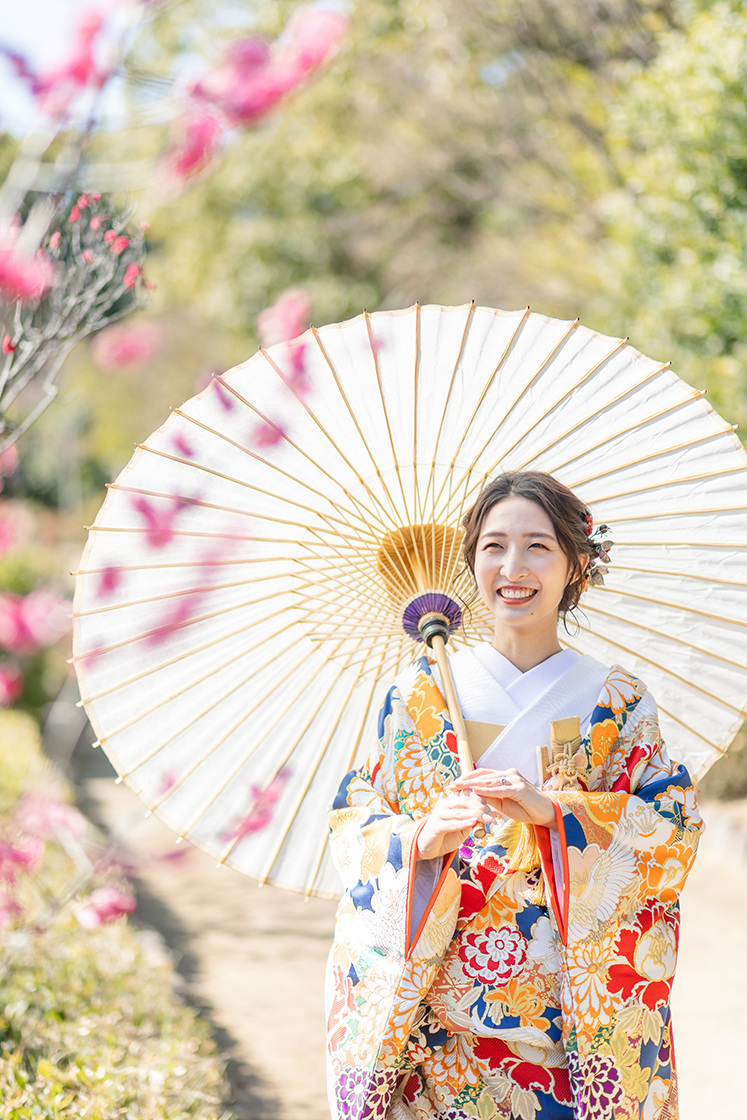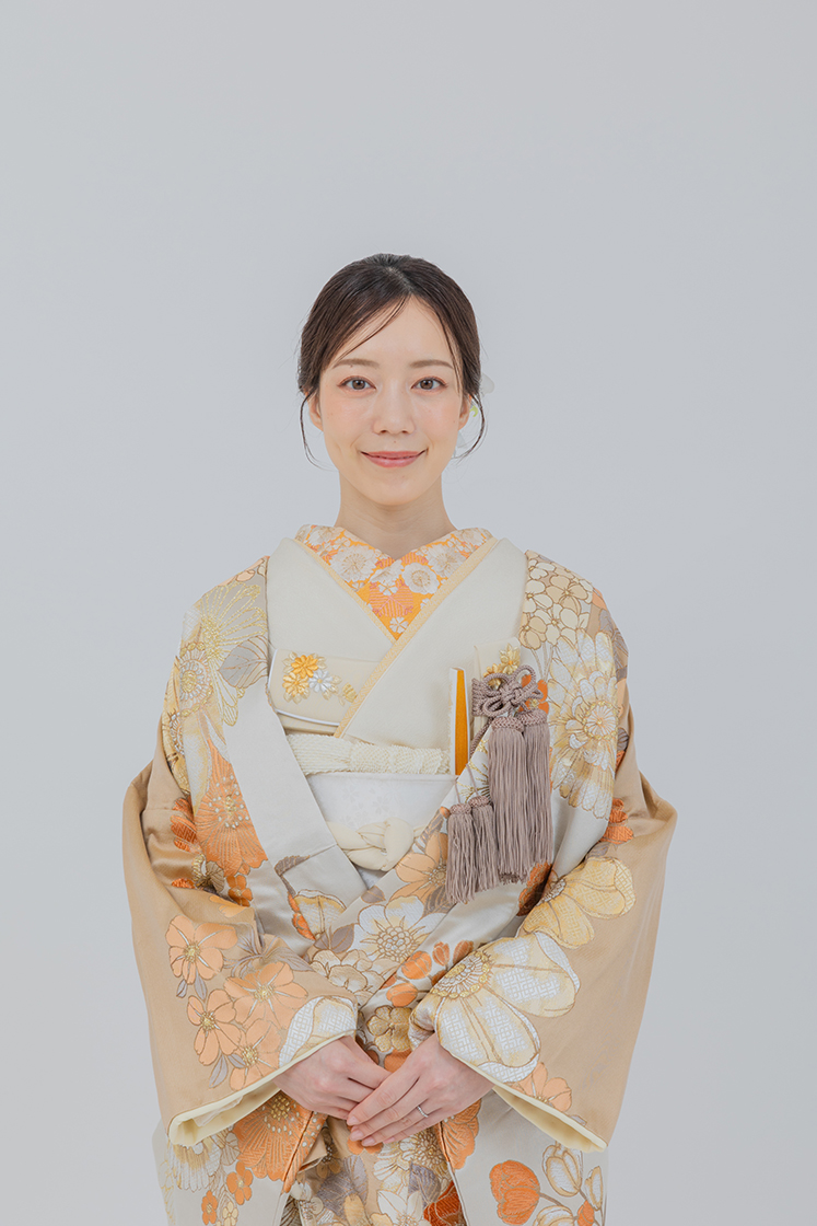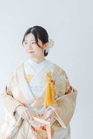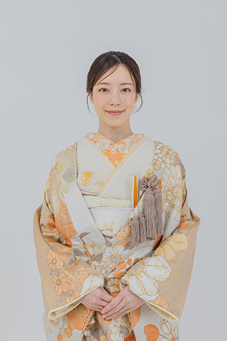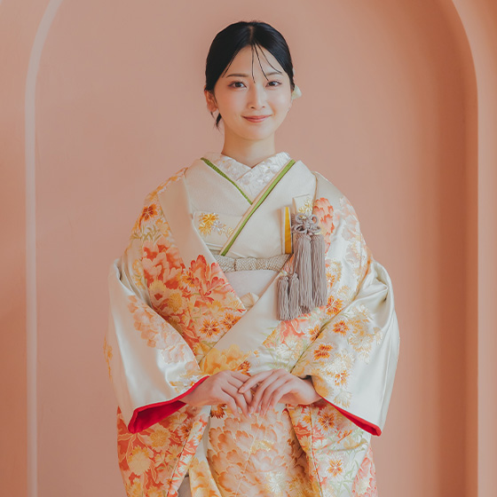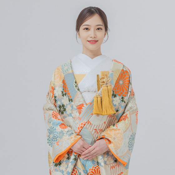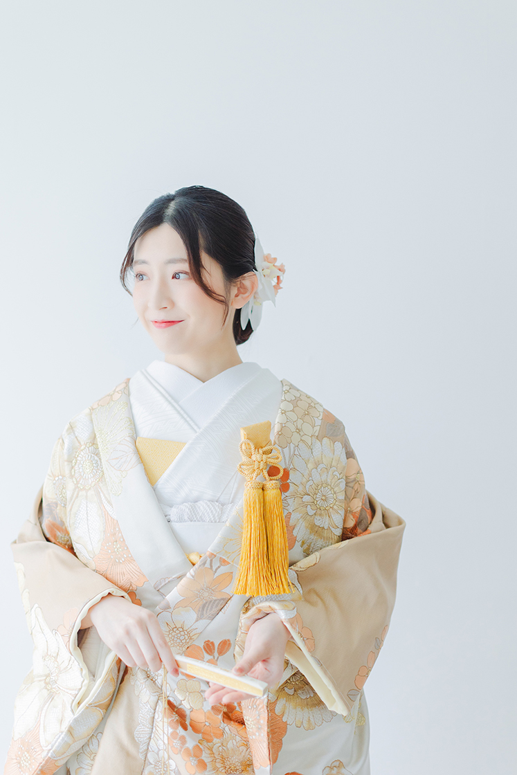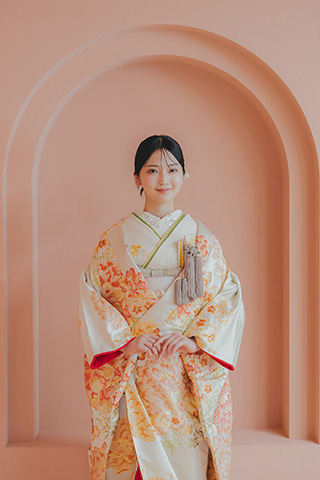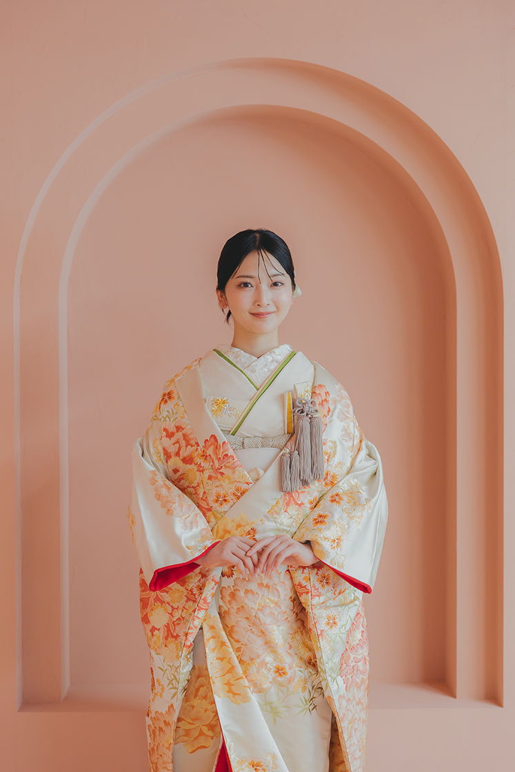 白地にオレンジの花が舞う、爽やかな色打掛。