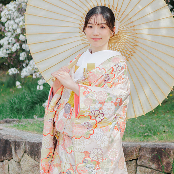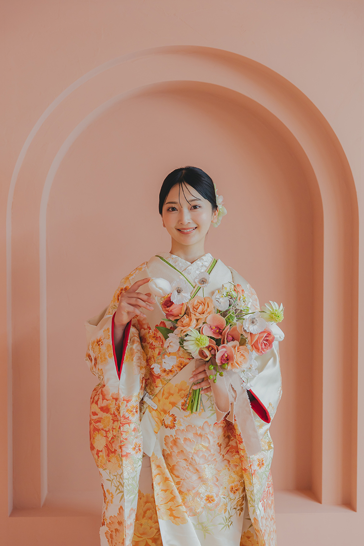優しい色合いが花嫁を柔らかく包み込みます。