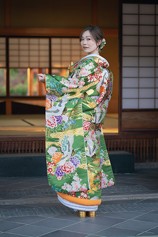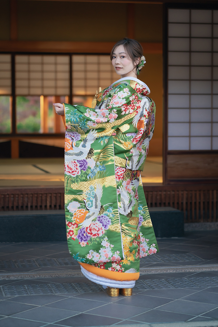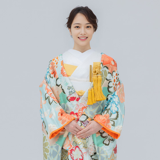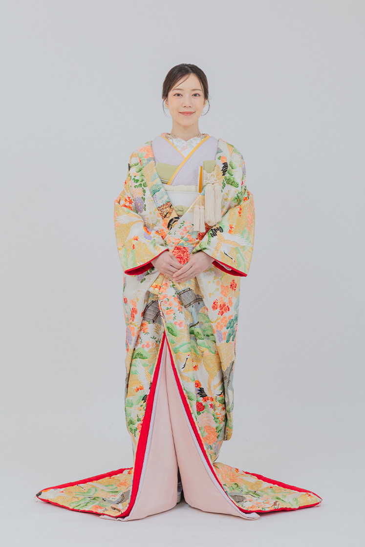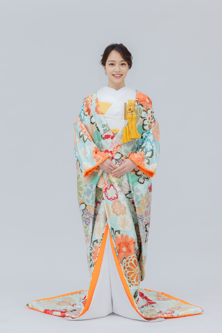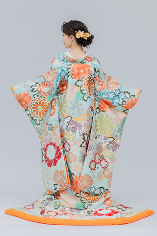 淡いグリーンを基調に、花々が散りばめられた打掛。
