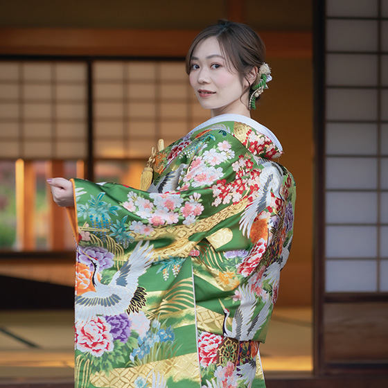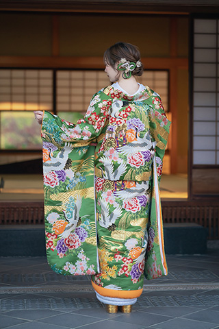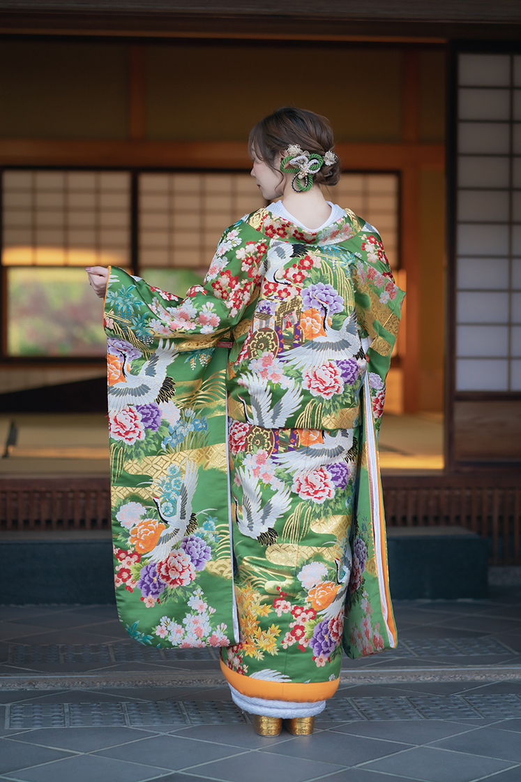 鮮やかな緑に大輪の花々が咲く、格調高い一着。