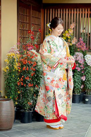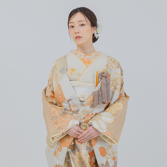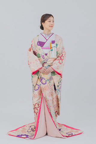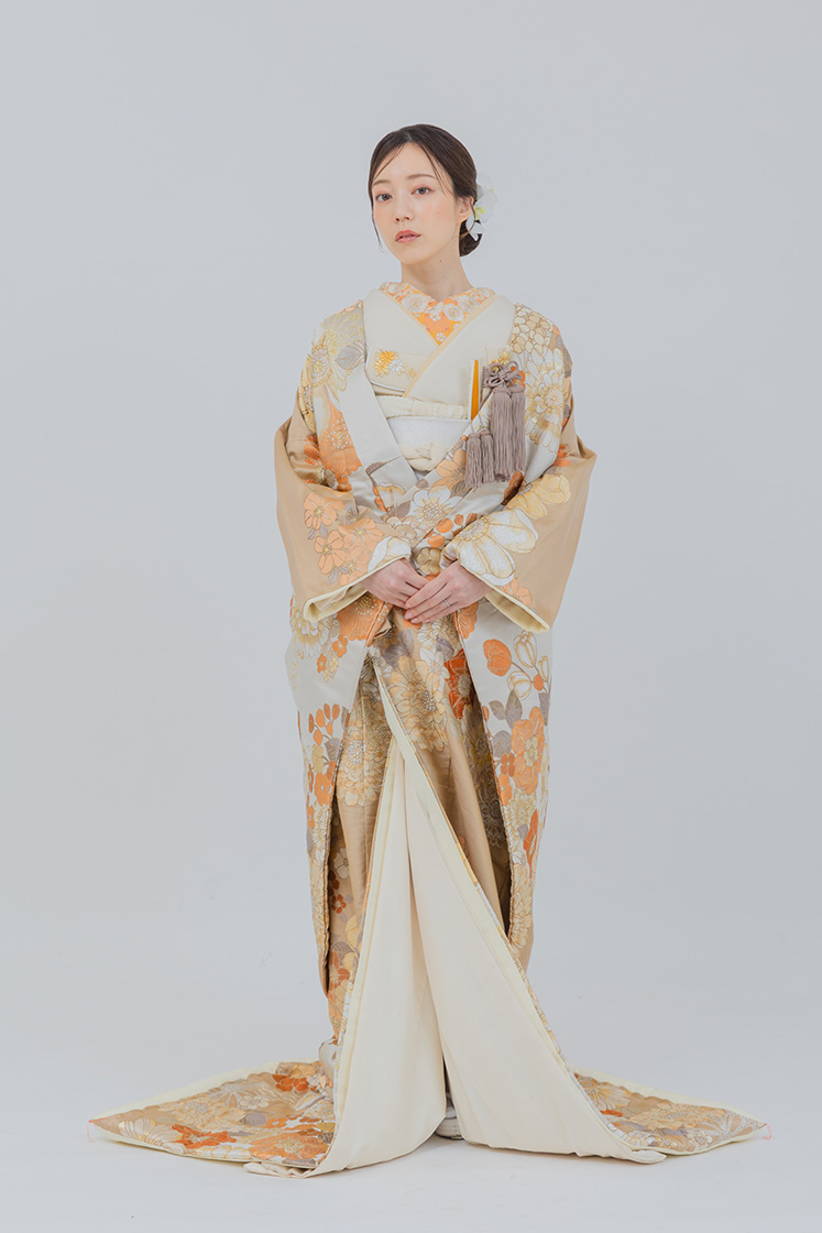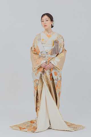 ベージュを基調に花々が織り込まれた上品な打掛。