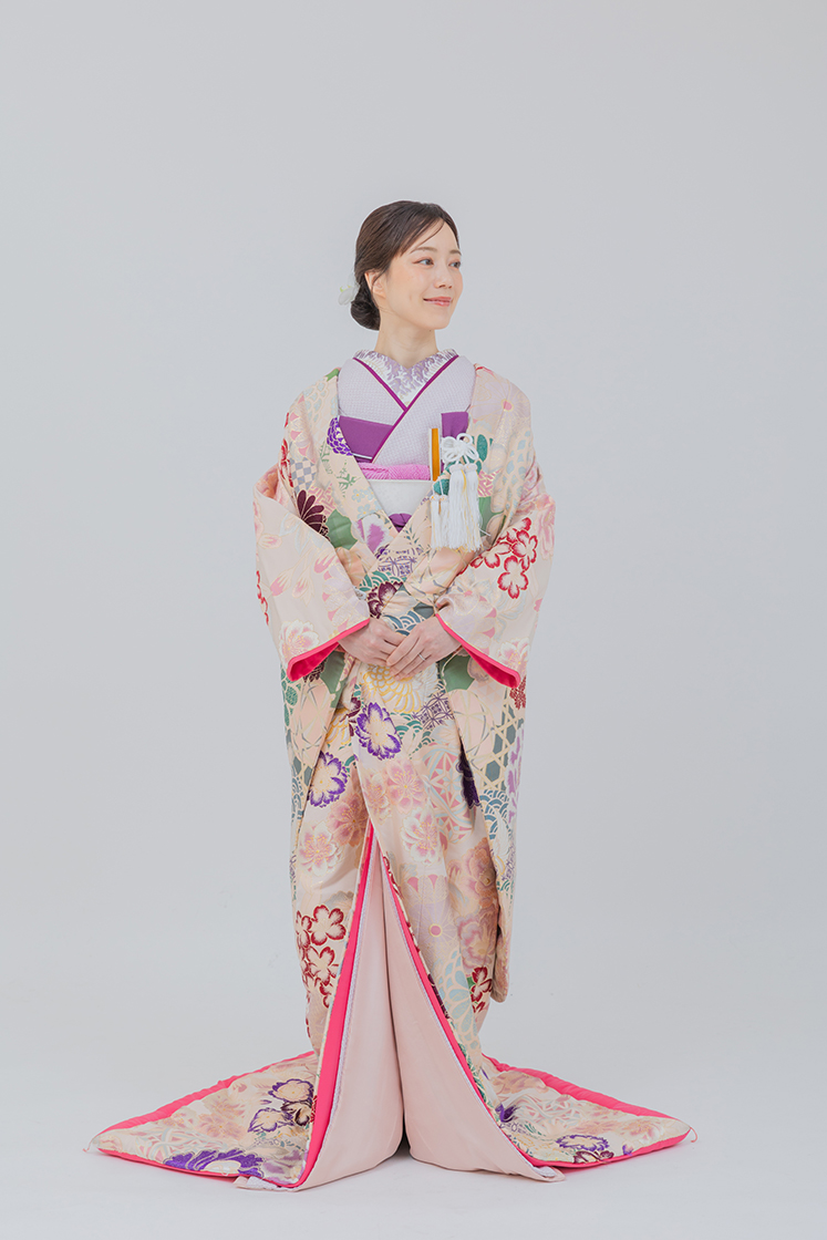 淡いピンクを基調に、上品な花文様が広がる打掛。
