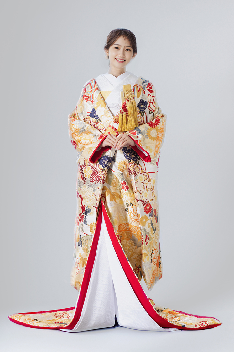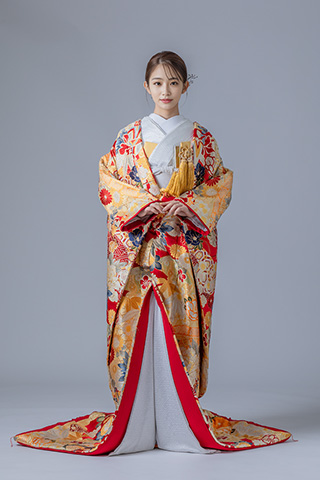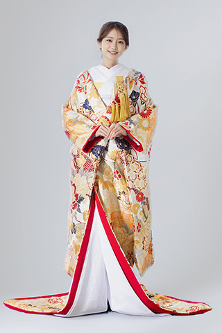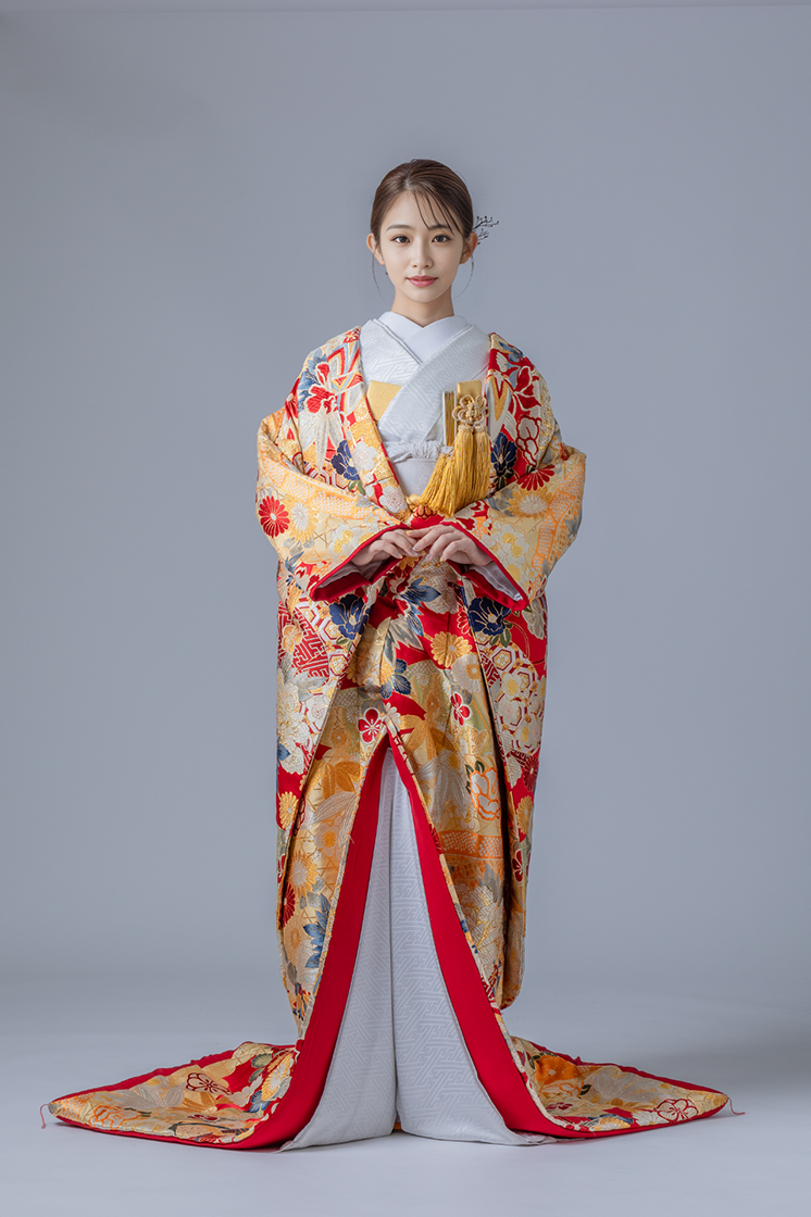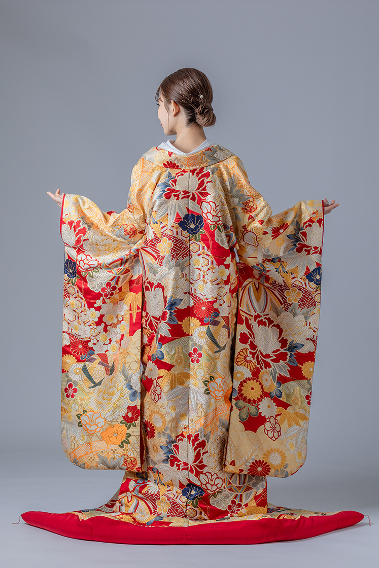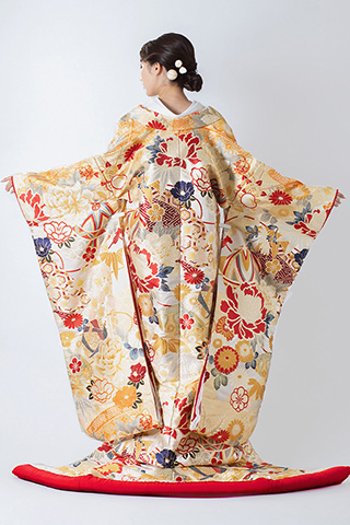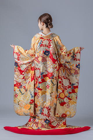 金地に赤の差し色が映える豪華な色打掛。