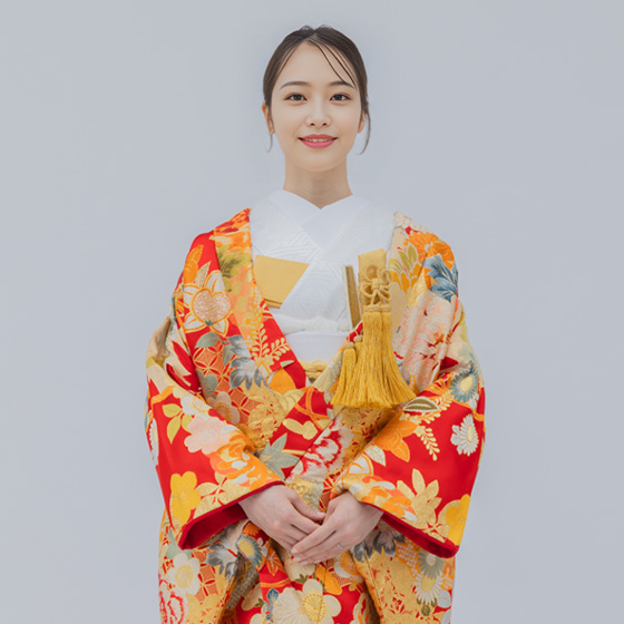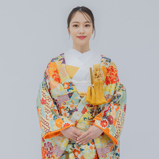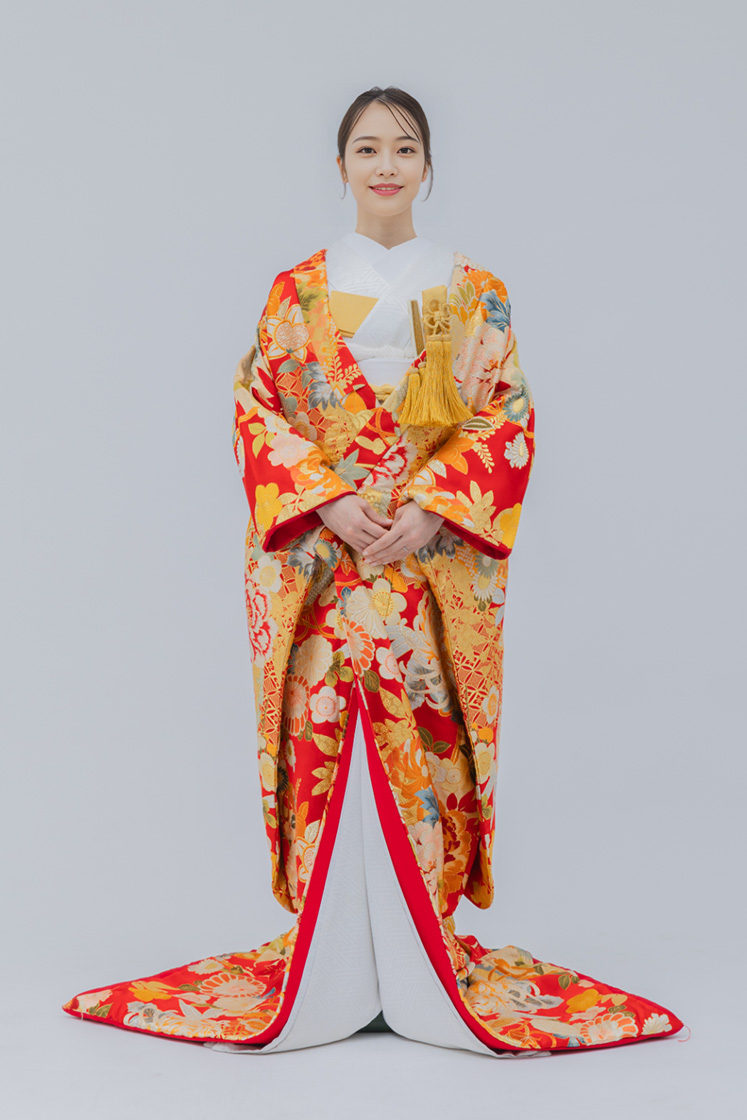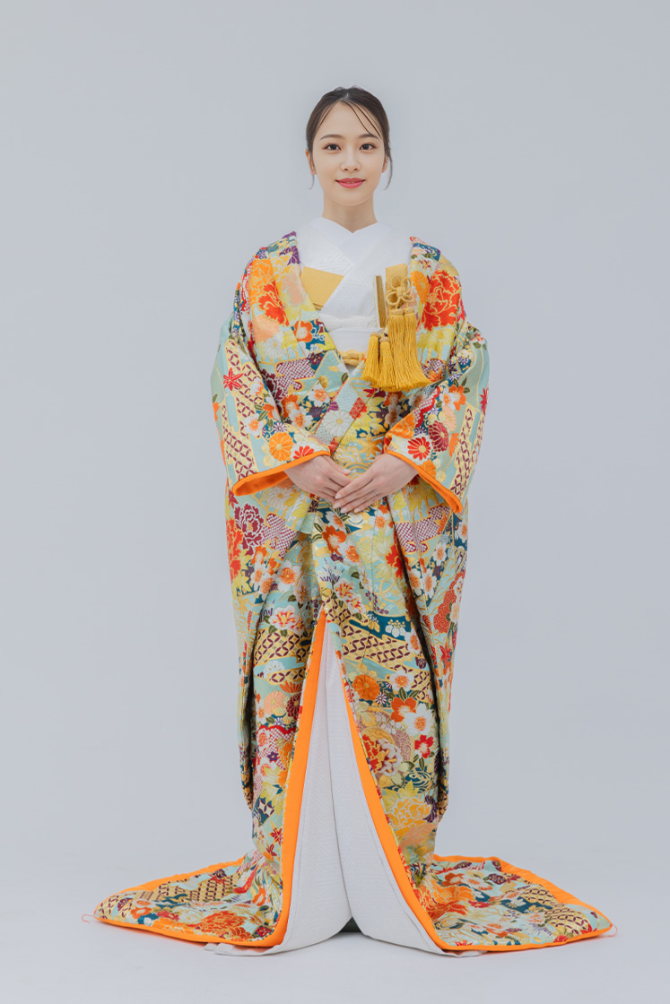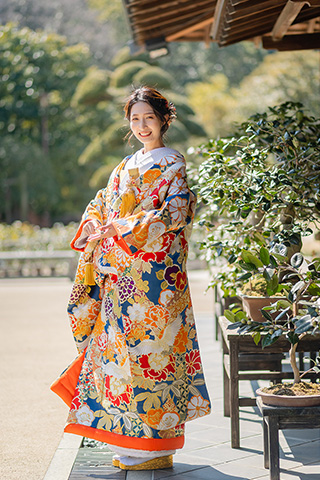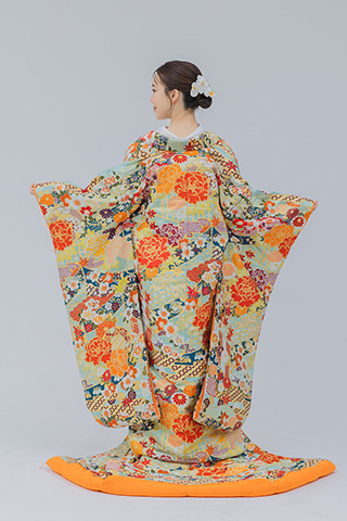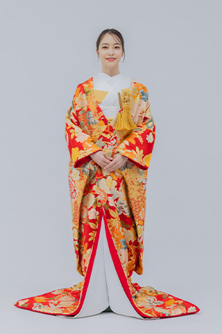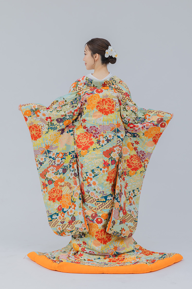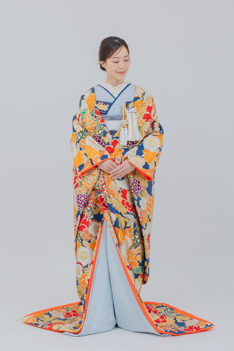 鮮やかなオレンジに花模様が映える華やかな打掛。