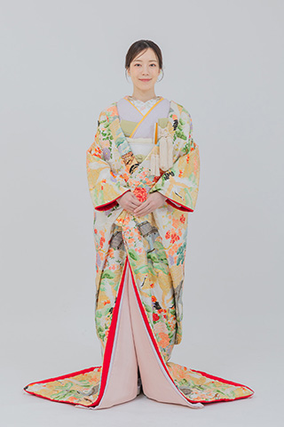 明るい金地に四季の花々が咲き誇る色打掛。